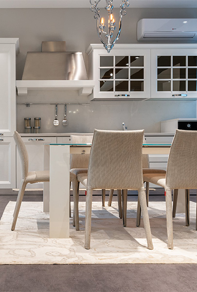 The compact and well-proportioned silhouette of both the seats and the small sofa, opens up to a new way of using the dining space: as a living room within the living room, a hybrid situation.