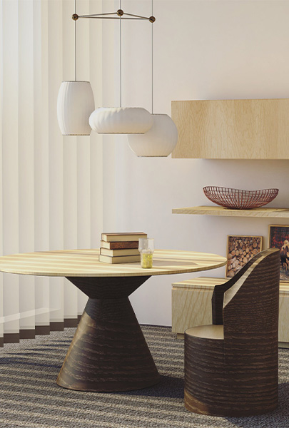 The compact and well-proportioned silhouette of both the seats and the small sofa, opens up to a new way of using the dining space: as a living room within the living room, a hybrid situation.